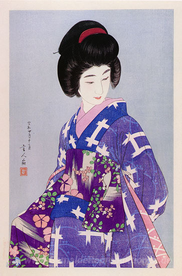Wir bieten Ihnen eine handgefertigte Reproduktion auf Leinwand des berühmten Kunstwerks 'Vorbereitung ihrer Schärpe' von Torii Kotondo, aus dem Reproduktionsmuseum.