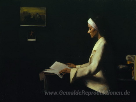 Wir bieten Ihnen eine handgefertigte Reproduktion auf Leinwand des berühmten Kunstwerks 'Woman Reading' von Dana Levin, aus dem Reproduktionsmuseum.