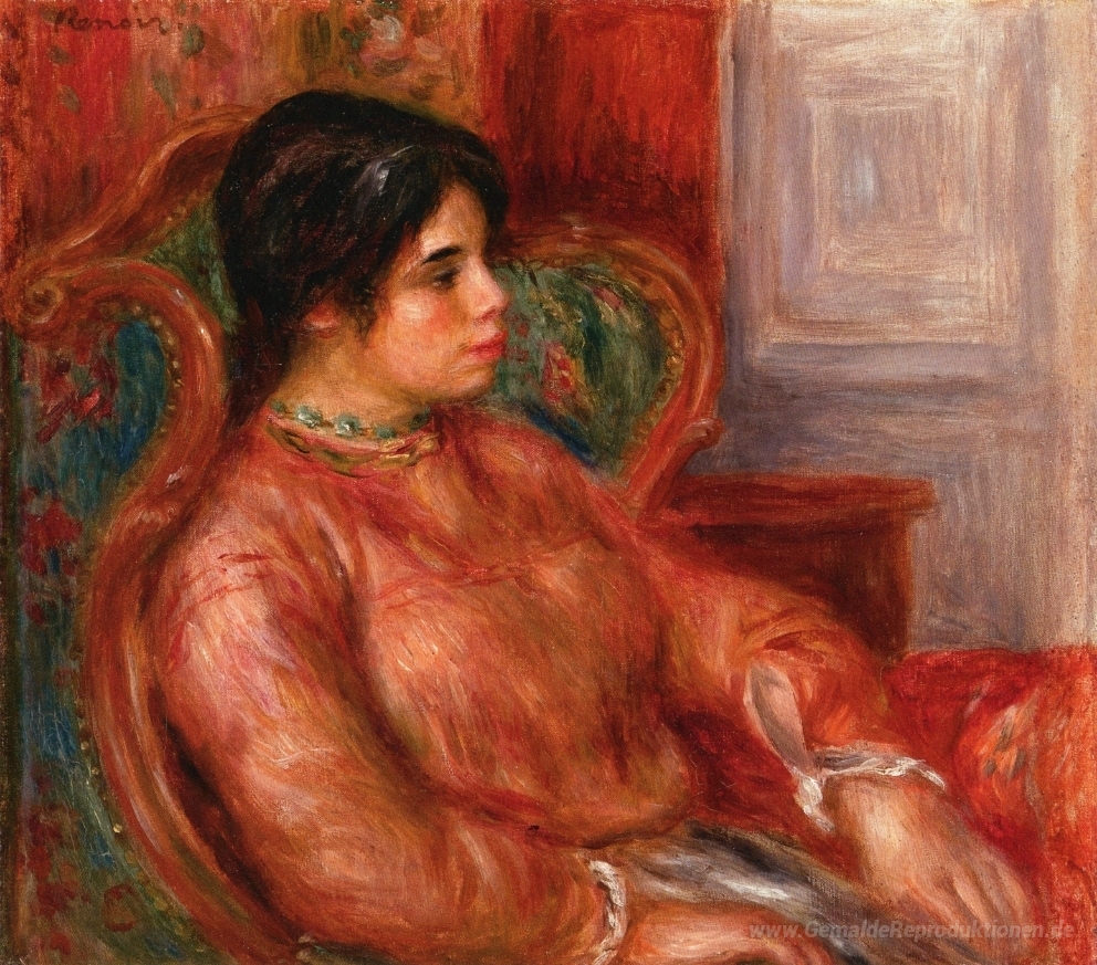 Wir bieten Ihnen eine handgefertigte Reproduktion auf Leinwand des berühmten Kunstwerks 'Woman with Green Chair' von Pierre-Auguste Renoir, aus dem Reproduktionsmuseum.