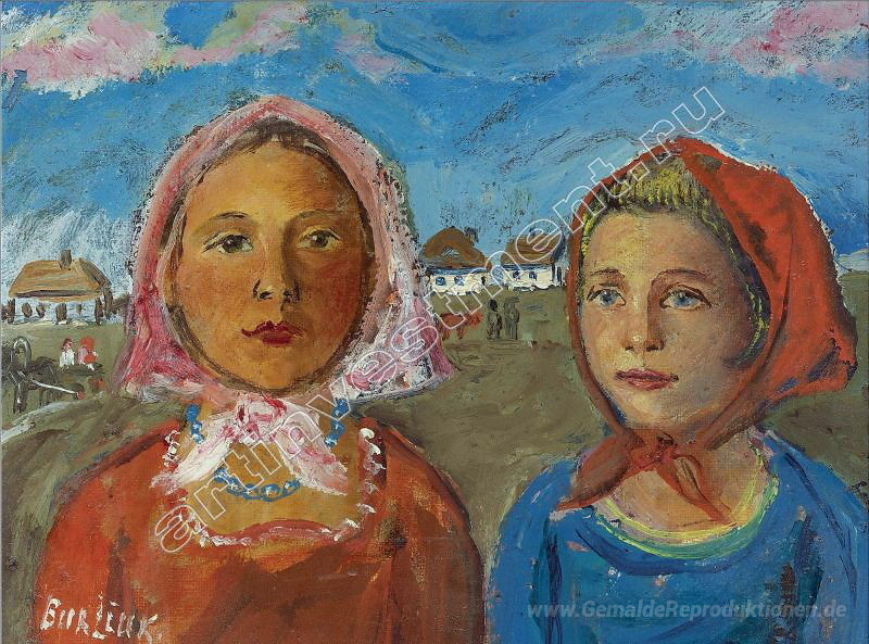Wir bieten Ihnen eine handgefertigte Reproduktion auf Leinwand des berühmten Kunstwerks 'Zwei Schwestern' von David Burliuk, aus dem Reproduktionsmuseum.