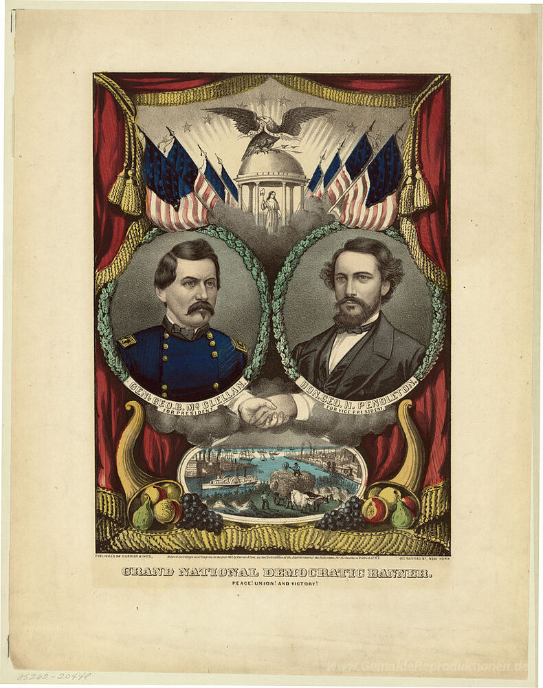 Wir bieten Ihnen eine handgefertigte Reproduktion auf Leinwand des berühmten Kunstwerks 'Demokratischen Präsidentschafts-Ticket' von Currier and Ives, aus dem Reproduktionsmuseum.
