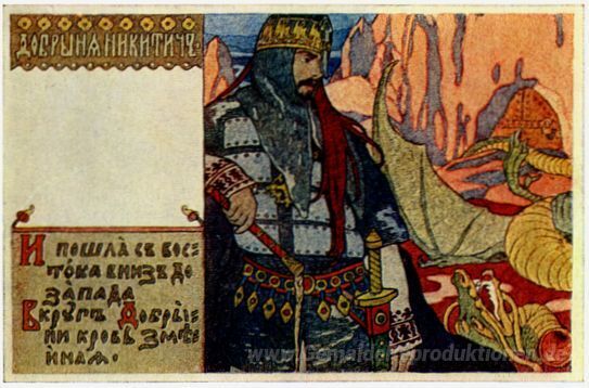 Wir bieten Ihnen eine handgefertigte Reproduktion auf Leinwand des berühmten Kunstwerks 'Dobrynya Nikitich' von Ivan Bilibin, aus dem Reproduktionsmuseum.