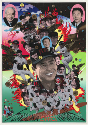 Wir bieten Ihnen eine handgefertigte Reproduktion auf Leinwand des berühmten Kunstwerks 'Fukuoka Daiei Hawks' von Tadanori Yokoo, aus dem Reproduktionsmuseum.