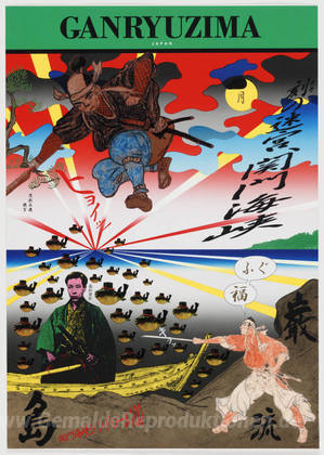 Wir bieten Ihnen eine handgefertigte Reproduktion auf Leinwand des berühmten Kunstwerks 'Ganryuzima' von Tadanori Yokoo, aus dem Reproduktionsmuseum.
