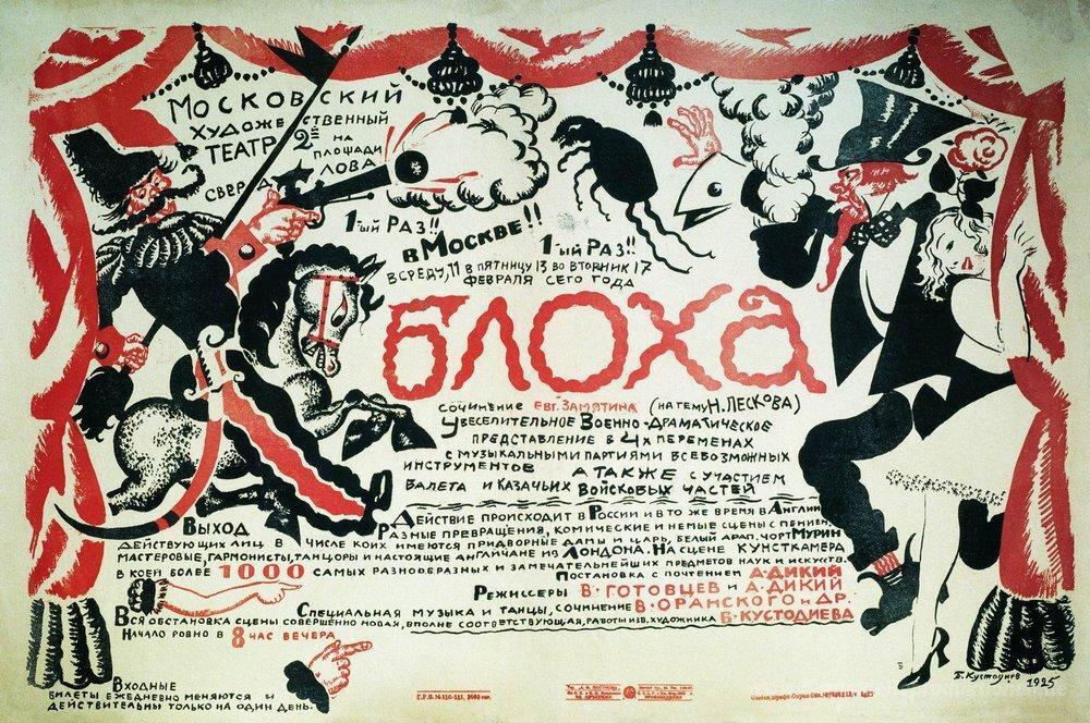 Wir bieten Ihnen eine handgefertigte Reproduktion auf Leinwand des berühmten Kunstwerks 'Plakat des Theaterstücks "Flea"' von Boris Kustodiev, aus dem Reproduktionsmuseum.