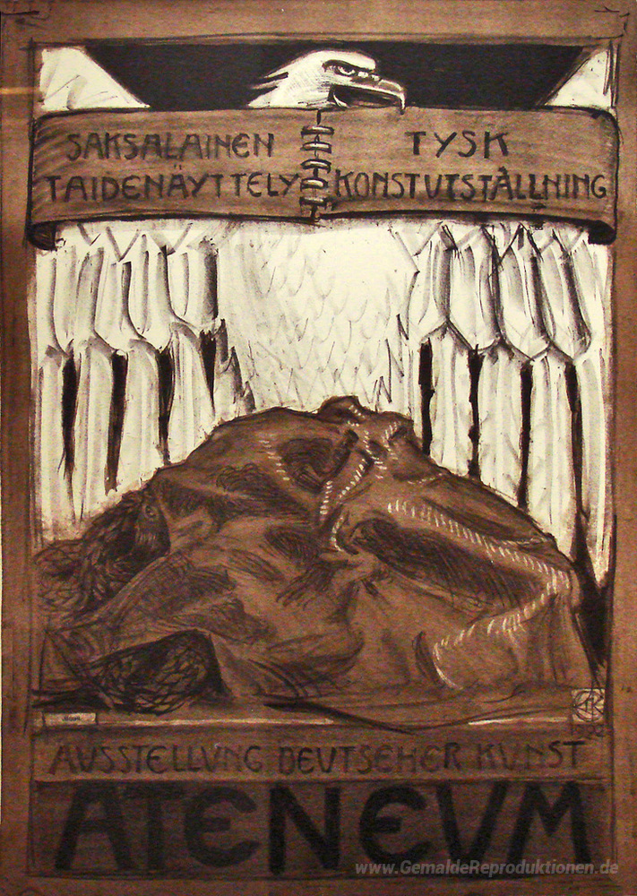 Wir bieten Ihnen eine handgefertigte Reproduktion auf Leinwand des berühmten Kunstwerks 'Plakat für die deutsche Ausstellung von Kunst in Ateneum' von Akseli Gallen-Kallela, aus dem Reproduktionsmuseum.