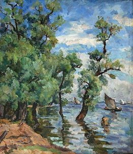 Gurzuf. Die Bäume auf dem Hintergrund des Meeres.