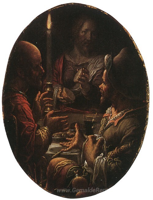 Wir bieten Ihnen eine handgefertigte Reproduktion auf Leinwand des berühmten Kunstwerks 'Abendmahl in Emmaus' von Joachim Wtewael, aus dem Reproduktionsmuseum.