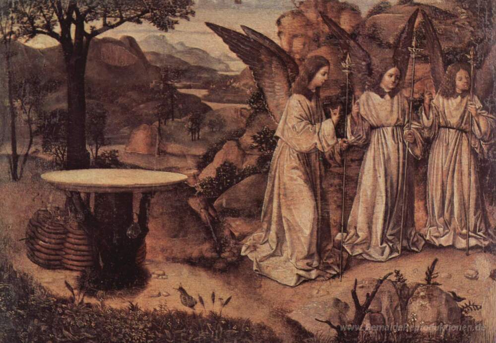 Wir bieten Ihnen eine handgefertigte Reproduktion auf Leinwand des berühmten Kunstwerks 'Abraham Serviert von drei Engel' von Antonello da Messina, aus dem Reproduktionsmuseum.