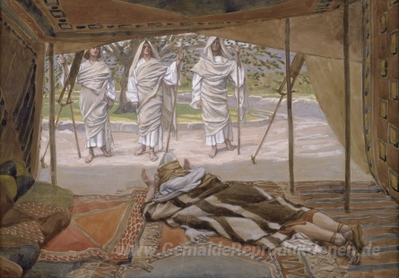 Wir bieten Ihnen eine handgefertigte Reproduktion auf Leinwand des berühmten Kunstwerks 'Abraham und die drei Engel' von James Tissot, aus dem Reproduktionsmuseum.