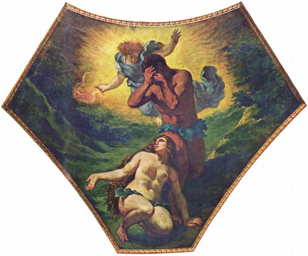 Wir bieten Ihnen eine handgefertigte Reproduktion auf Leinwand des berühmten Kunstwerks 'Adam und Eva' von Eugene Delacroix, aus dem Reproduktionsmuseum.