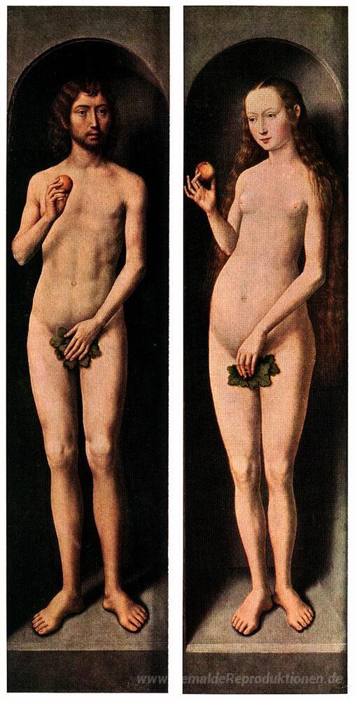 Wir bieten Ihnen eine handgefertigte Reproduktion auf Leinwand des berühmten Kunstwerks 'Adam und Eva' von Hans Memling, aus dem Reproduktionsmuseum.