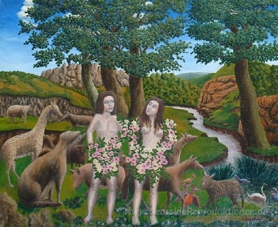 Wir bieten Ihnen eine handgefertigte Reproduktion auf Leinwand des berühmten Kunstwerks 'Adam und Eva' von Andre Bauchant, aus dem Reproduktionsmuseum.