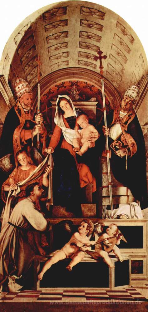 Wir bieten Ihnen eine handgefertigte Reproduktion auf Leinwand des berühmten Kunstwerks 'Altar von Recanati Polyptychon, Hauptplatine: Thronende Maria mi' von Lorenzo Lotto, aus dem Reproduktionsmuseum.