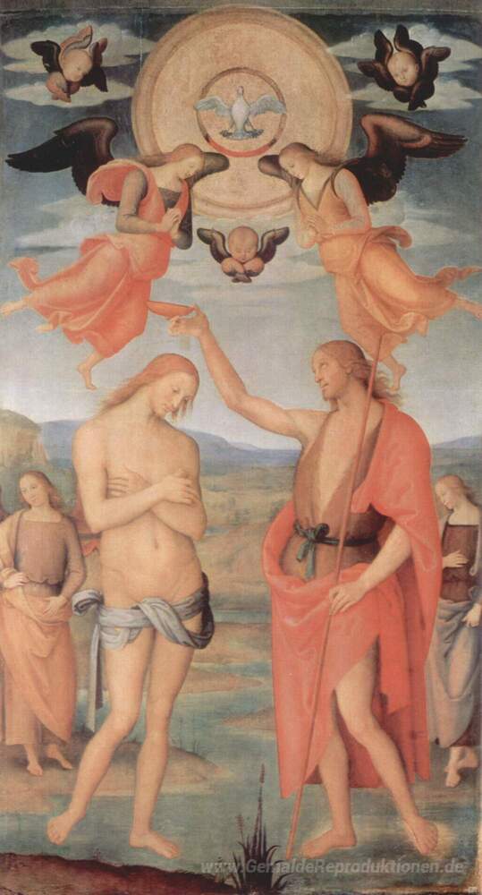 Wir bieten Ihnen eine handgefertigte Reproduktion auf Leinwand des berühmten Kunstwerks 'Altarbild des heiligen Augustinus - Szene Taufe Christi' von Pietro Perugino, aus dem Reproduktionsmuseum.