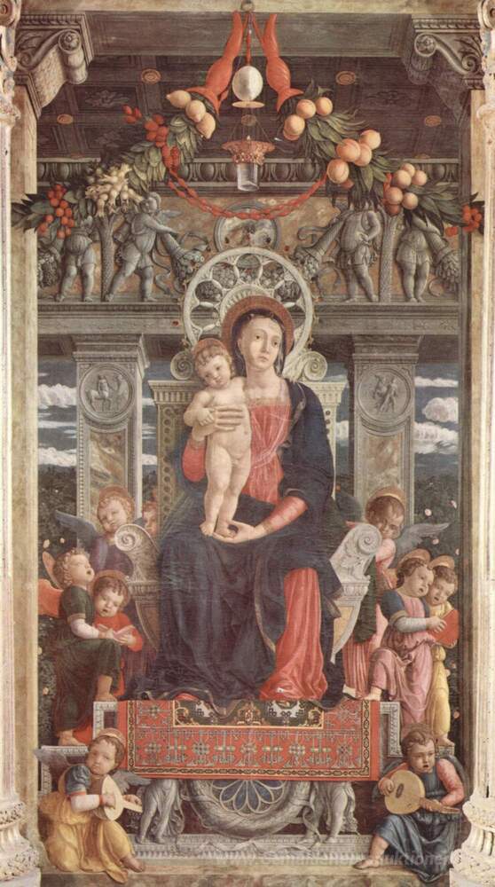 Wir bieten Ihnen eine handgefertigte Reproduktion auf Leinwand des berühmten Kunstwerks 'Altarpiece von San Zeno in Verona, Mitteltafel Madonna und Engel' von Andrea Mantegna, aus dem Reproduktionsmuseum.