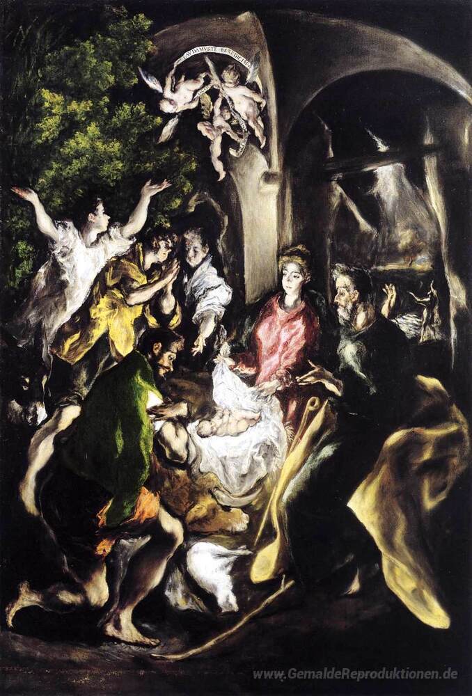 Wir bieten Ihnen eine handgefertigte Reproduktion auf Leinwand des berühmten Kunstwerks 'Anbetung der Hirten' von El Greco, aus dem Reproduktionsmuseum.