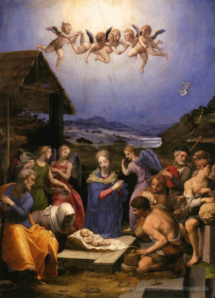 Wir bieten Ihnen eine handgefertigte Reproduktion auf Leinwand des berühmten Kunstwerks 'Anbetung der Hirten' von Agnolo Bronzino, aus dem Reproduktionsmuseum.
