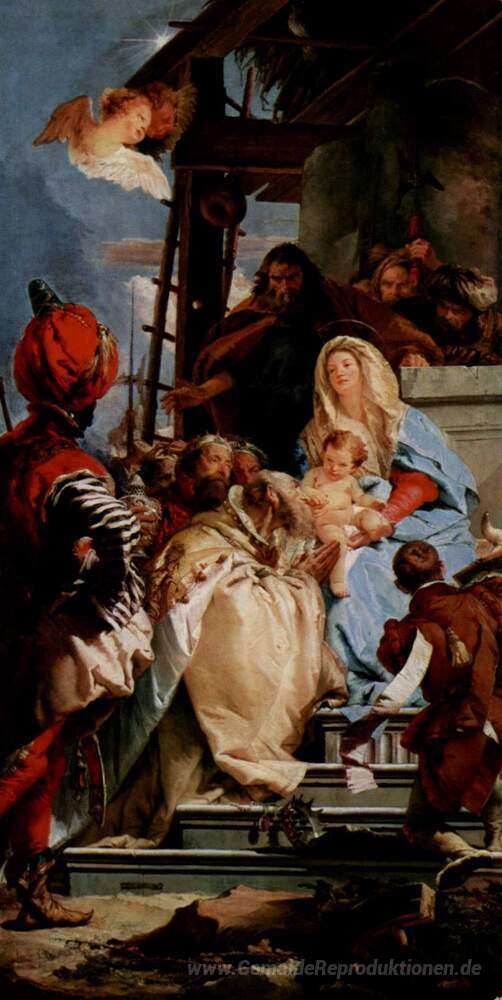 Wir bieten Ihnen eine handgefertigte Reproduktion auf Leinwand des berühmten Kunstwerks 'Anbetung der Könige' von Giovanni Battista Tiepolo, aus dem Reproduktionsmuseum.