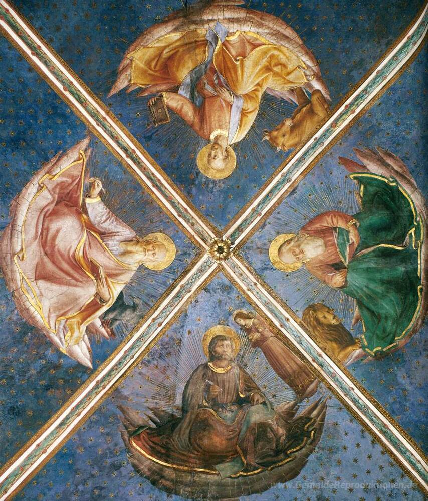 Wir bieten Ihnen eine handgefertigte Reproduktion auf Leinwand des berühmten Kunstwerks 'Ansicht der Kapelle Gewölbe' von Fra Angelico, aus dem Reproduktionsmuseum.