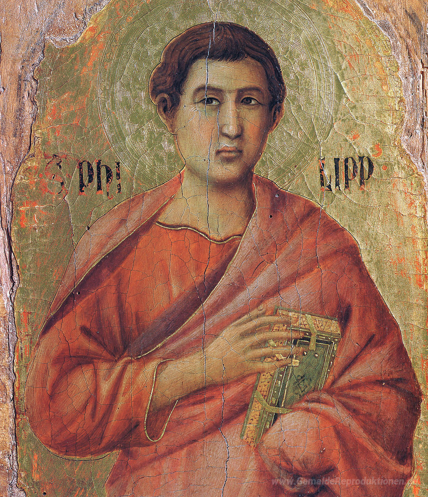 Wir bieten Ihnen eine handgefertigte Reproduktion auf Leinwand des berühmten Kunstwerks 'Apostel Philippus' von Duccio, aus dem Reproduktionsmuseum.
