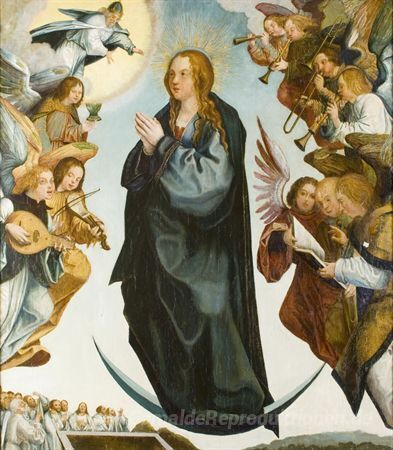 Wir bieten Ihnen eine handgefertigte Reproduktion auf Leinwand des berühmten Kunstwerks 'Assunção da Virgem ladeada de anjos músicos' von Gregorio Lopes, aus dem Reproduktionsmuseum.