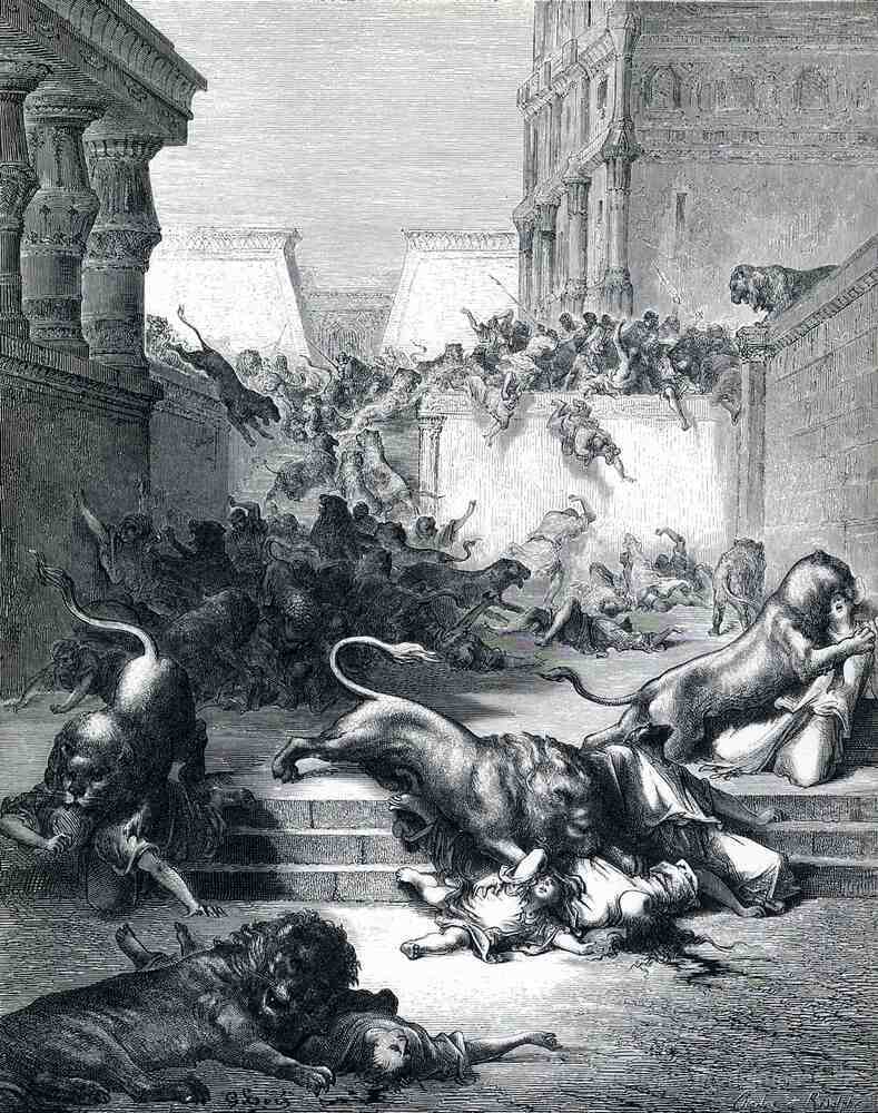 Wir bieten Ihnen eine handgefertigte Reproduktion auf Leinwand des berühmten Kunstwerks 'Ausländische Nationen von Lions in Samaria erschlagen' von Gustave Dore, aus dem Reproduktionsmuseum.