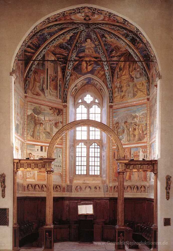 Wir bieten Ihnen eine handgefertigte Reproduktion auf Leinwand des berühmten Kunstwerks 'Blick auf die Hauptapsiskapelle' von Benozzo Gozzoli, aus dem Reproduktionsmuseum.