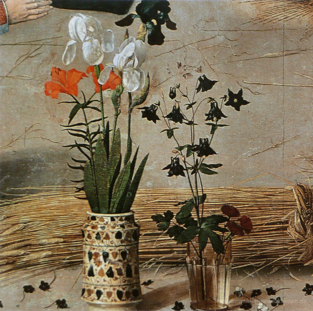 Wir bieten Ihnen eine handgefertigte Reproduktion auf Leinwand des berühmten Kunstwerks 'Blume (Detail aus der Mitteltafel des Portinari-Altar)' von Hugo van der Goes, aus dem Reproduktionsmuseum.