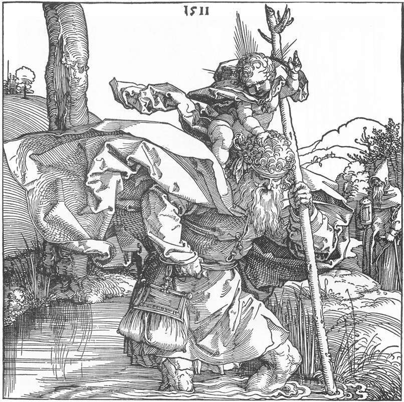 Wir bieten Ihnen eine handgefertigte Reproduktion auf Leinwand des berühmten Kunstwerks 'Christophorus trägt das Jesuskind' von Albrecht Durer, aus dem Reproduktionsmuseum.
