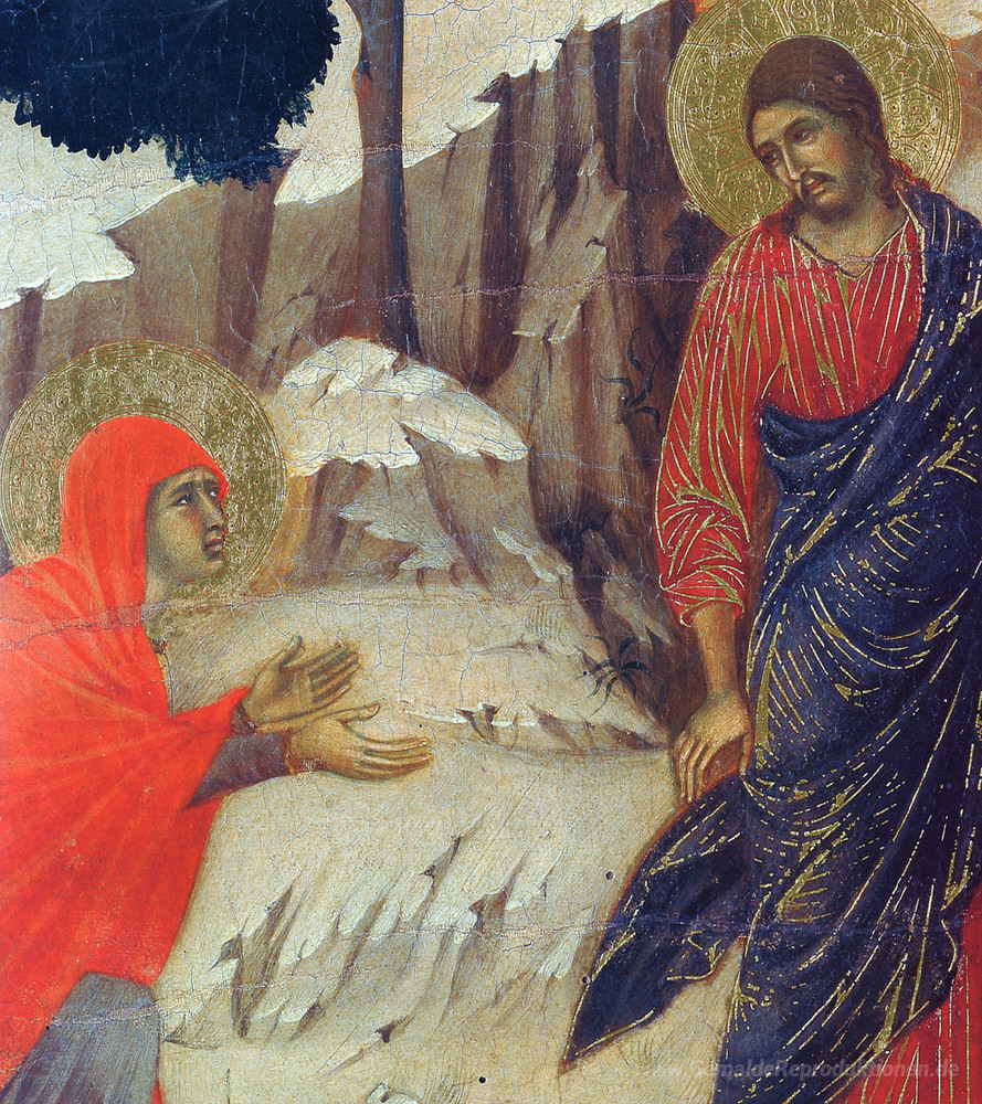 Wir bieten Ihnen eine handgefertigte Reproduktion auf Leinwand des berühmten Kunstwerks 'Christus erscheint Maria Magdalena (Fragment)' von Duccio, aus dem Reproduktionsmuseum.