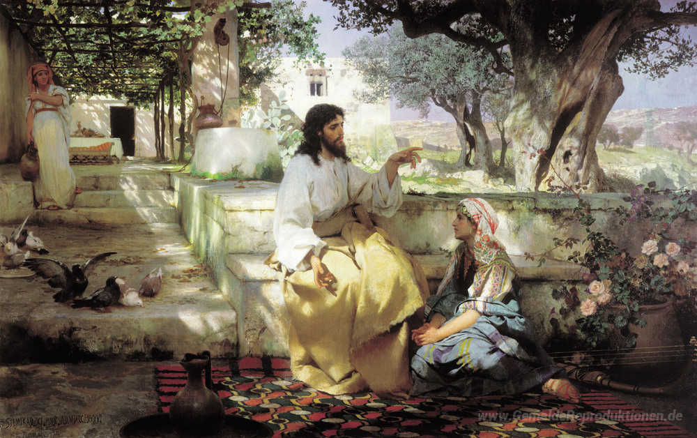 Wir bieten Ihnen eine handgefertigte Reproduktion auf Leinwand des berühmten Kunstwerks 'Christus im Haus von Martha und Maria' von Henryk Siemiradzki, aus dem Reproduktionsmuseum.