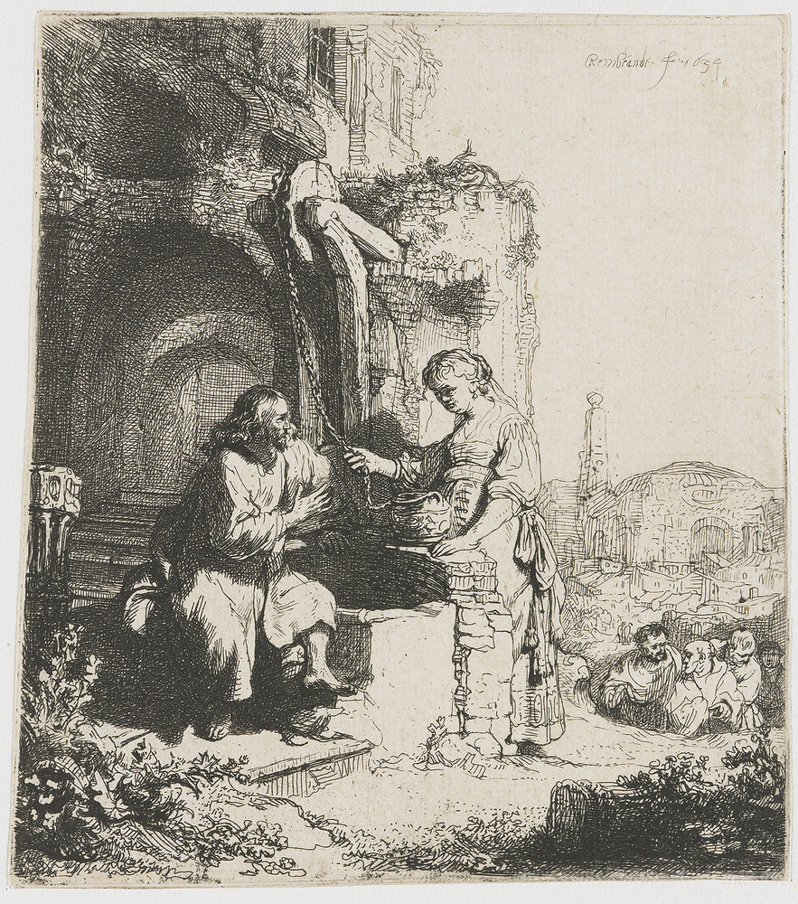 Wir bieten Ihnen eine handgefertigte Reproduktion auf Leinwand des berühmten Kunstwerks 'Christus und die Samariterin zwischen Ruinen' von Rembrandt, aus dem Reproduktionsmuseum.