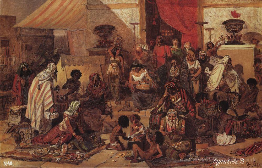 Wir bieten Ihnen eine handgefertigte Reproduktion auf Leinwand des berühmten Kunstwerks 'Christus vertreibt die Händler aus dem Tempel' von Vasily Surikov, aus dem Reproduktionsmuseum.
