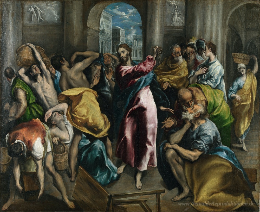 Wir bieten Ihnen eine handgefertigte Reproduktion auf Leinwand des berühmten Kunstwerks 'Christus vertreibt die Händler aus dem Tempel' von El Greco, aus dem Reproduktionsmuseum.