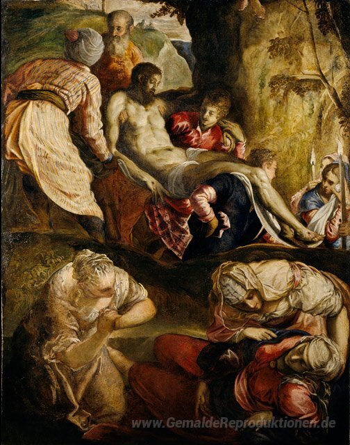 Wir bieten Ihnen eine handgefertigte Reproduktion auf Leinwand des berühmten Kunstwerks 'Christus zum Grab getragen' von Tintoretto, aus dem Reproduktionsmuseum.