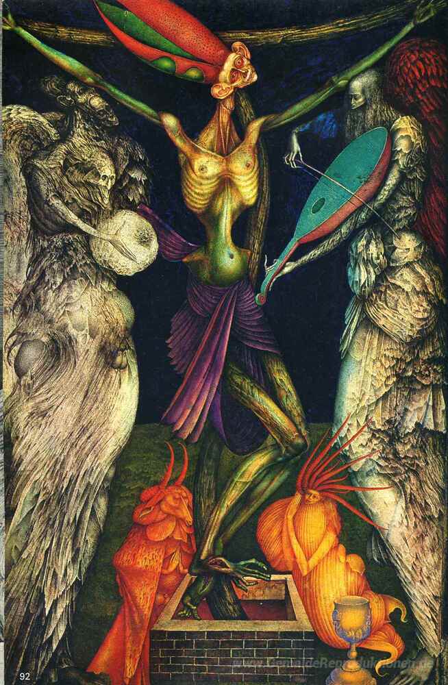 Wir bieten Ihnen eine handgefertigte Reproduktion auf Leinwand des berühmten Kunstwerks 'Crucification' von Ernst Fuchs, aus dem Reproduktionsmuseum.