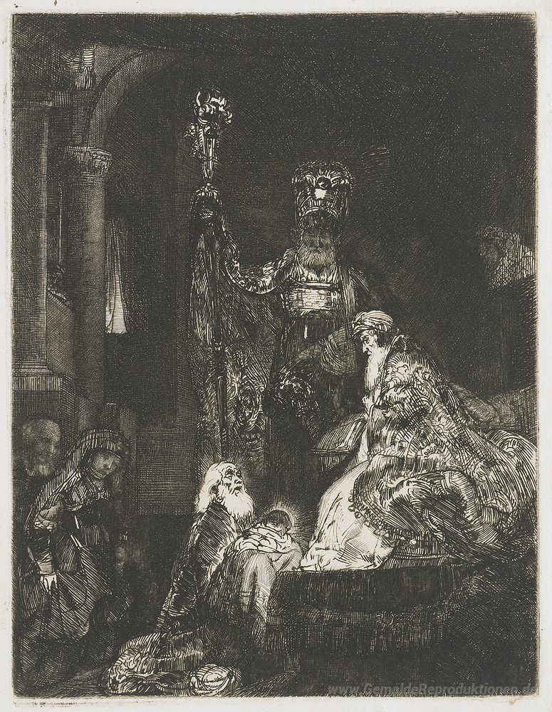 Wir bieten Ihnen eine handgefertigte Reproduktion auf Leinwand des berühmten Kunstwerks 'Darstellung im Tempel' von Rembrandt, aus dem Reproduktionsmuseum.