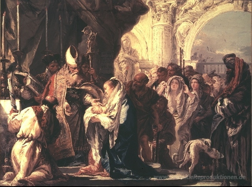 Wir bieten Ihnen eine handgefertigte Reproduktion auf Leinwand des berühmten Kunstwerks 'Darstellung im Tempel' von Giovanni Domenico Tiepolo, aus dem Reproduktionsmuseum.