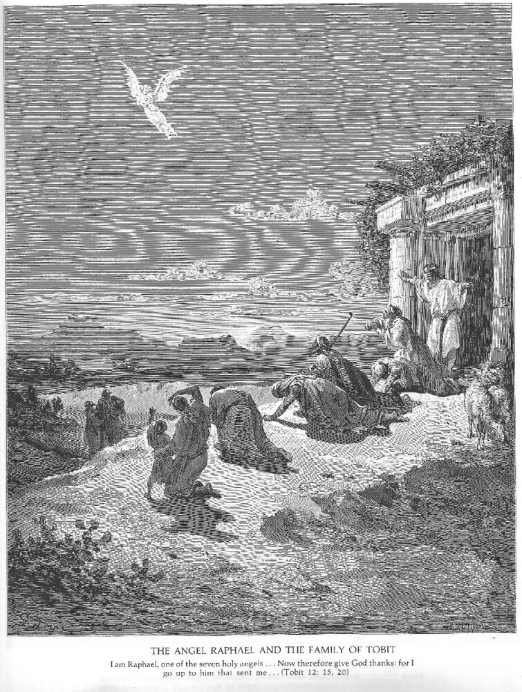 Wir bieten Ihnen eine handgefertigte Reproduktion auf Leinwand des berühmten Kunstwerks 'Das Engels-RAPHAEL und die Familie von Tobit' von Gustave Dore, aus dem Reproduktionsmuseum.