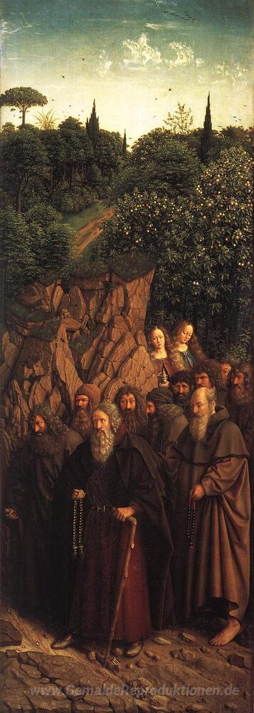 Wir bieten Ihnen eine handgefertigte Reproduktion auf Leinwand des berühmten Kunstwerks 'Das Gent-Altar (Detail)' von Jan van Eyck, aus dem Reproduktionsmuseum.