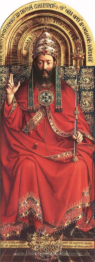 Wir bieten Ihnen eine handgefertigte Reproduktion auf Leinwand des berühmten Kunstwerks 'Das Gent-Altar (Detail)' von Jan van Eyck, aus dem Reproduktionsmuseum.