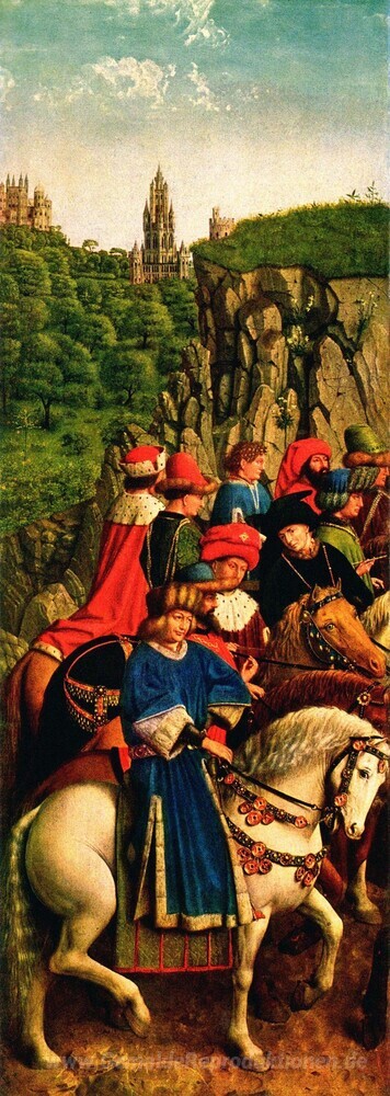 Wir bieten Ihnen eine handgefertigte Reproduktion auf Leinwand des berühmten Kunstwerks 'Das Gent-Altar (Detail)' von Jan van Eyck, aus dem Reproduktionsmuseum.