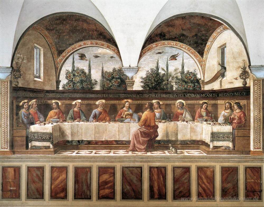 Wir bieten Ihnen eine handgefertigte Reproduktion auf Leinwand des berühmten Kunstwerks 'Das letzte Abendmahl' von Domenico Ghirlandaio, aus dem Reproduktionsmuseum.