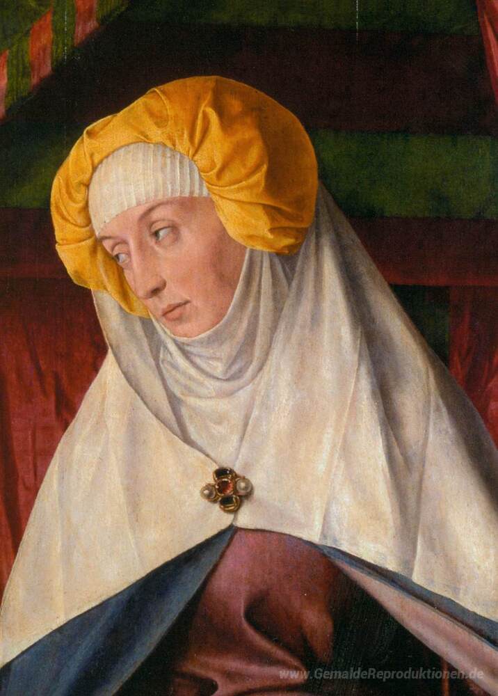 Wir bieten Ihnen eine handgefertigte Reproduktion auf Leinwand des berühmten Kunstwerks 'Das Moulins-Triptychon (Detail)' von Jean Hey, aus dem Reproduktionsmuseum.