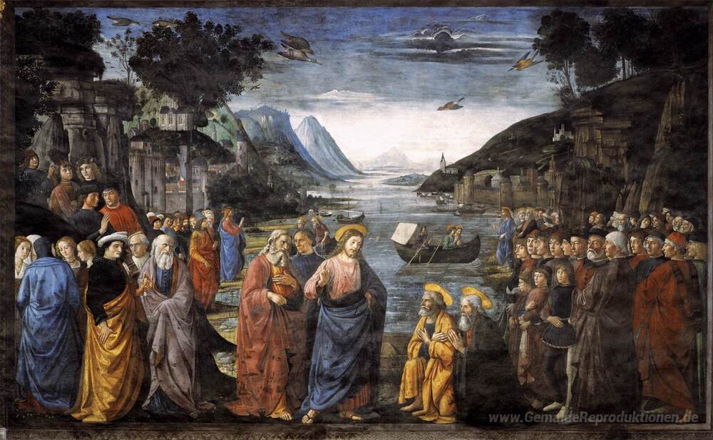 Wir bieten Ihnen eine handgefertigte Reproduktion auf Leinwand des berühmten Kunstwerks 'Das Nennen von St. Peter und St. Andreas' von Domenico Ghirlandaio, aus dem Reproduktionsmuseum.