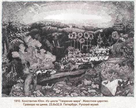 Wir bieten Ihnen eine handgefertigte Reproduktion auf Leinwand des berühmten Kunstwerks 'Das Tierreich' von Konstantin Yuon, aus dem Reproduktionsmuseum.