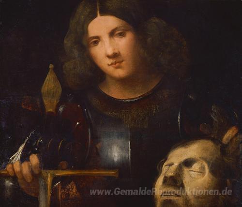 Wir bieten Ihnen eine handgefertigte Reproduktion auf Leinwand des berühmten Kunstwerks 'David mit dem Haupt des Goliath' von Giorgione, aus dem Reproduktionsmuseum.
