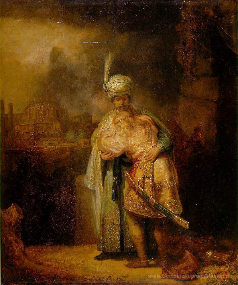 Wir bieten Ihnen eine handgefertigte Reproduktion auf Leinwand des berühmten Kunstwerks 'David und Jonathan' von Rembrandt, aus dem Reproduktionsmuseum.