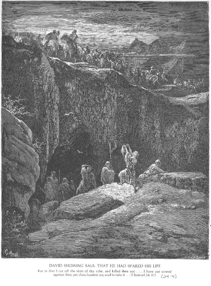Wir bieten Ihnen eine handgefertigte Reproduktion auf Leinwand des berühmten Kunstwerks 'David Zeigt Saul, wie er sein Leben verschont hatte' von Gustave Dore, aus dem Reproduktionsmuseum.